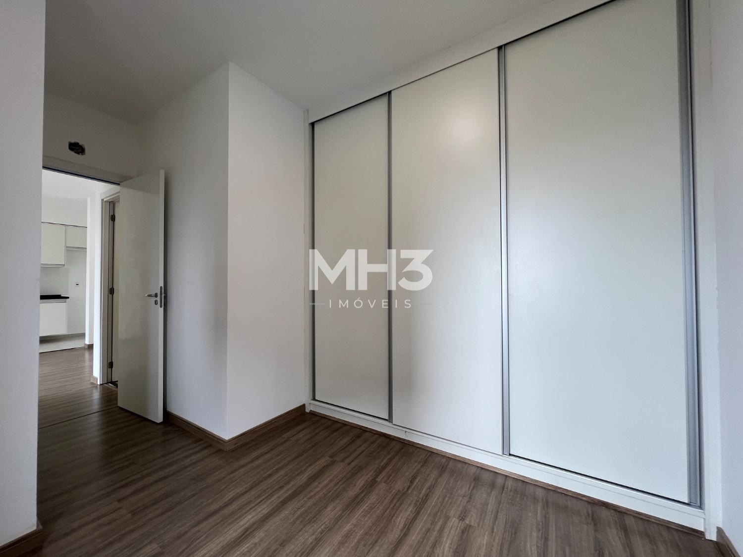 Quarto do casal, cozinha e banheiro com armários planejados.