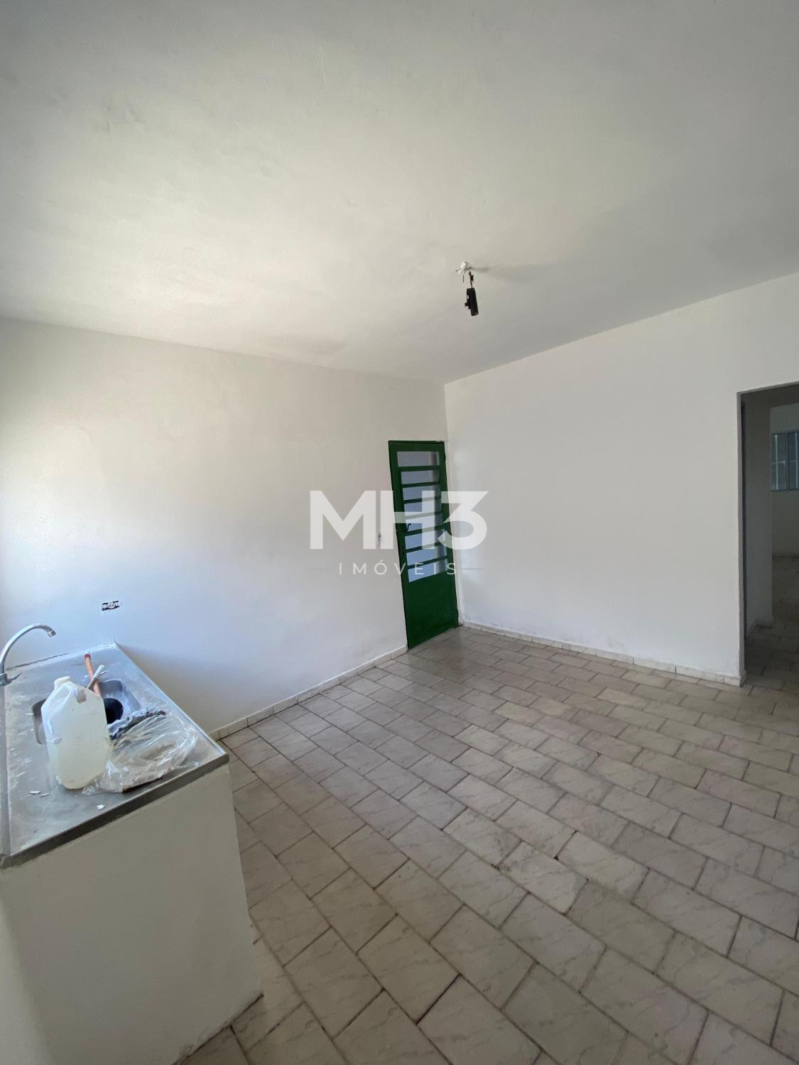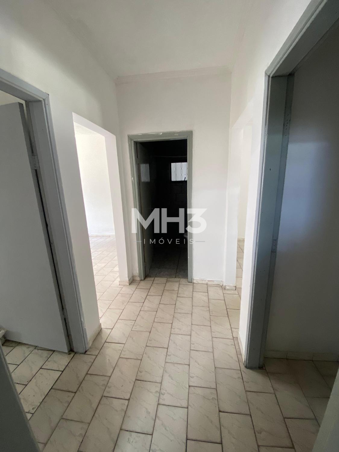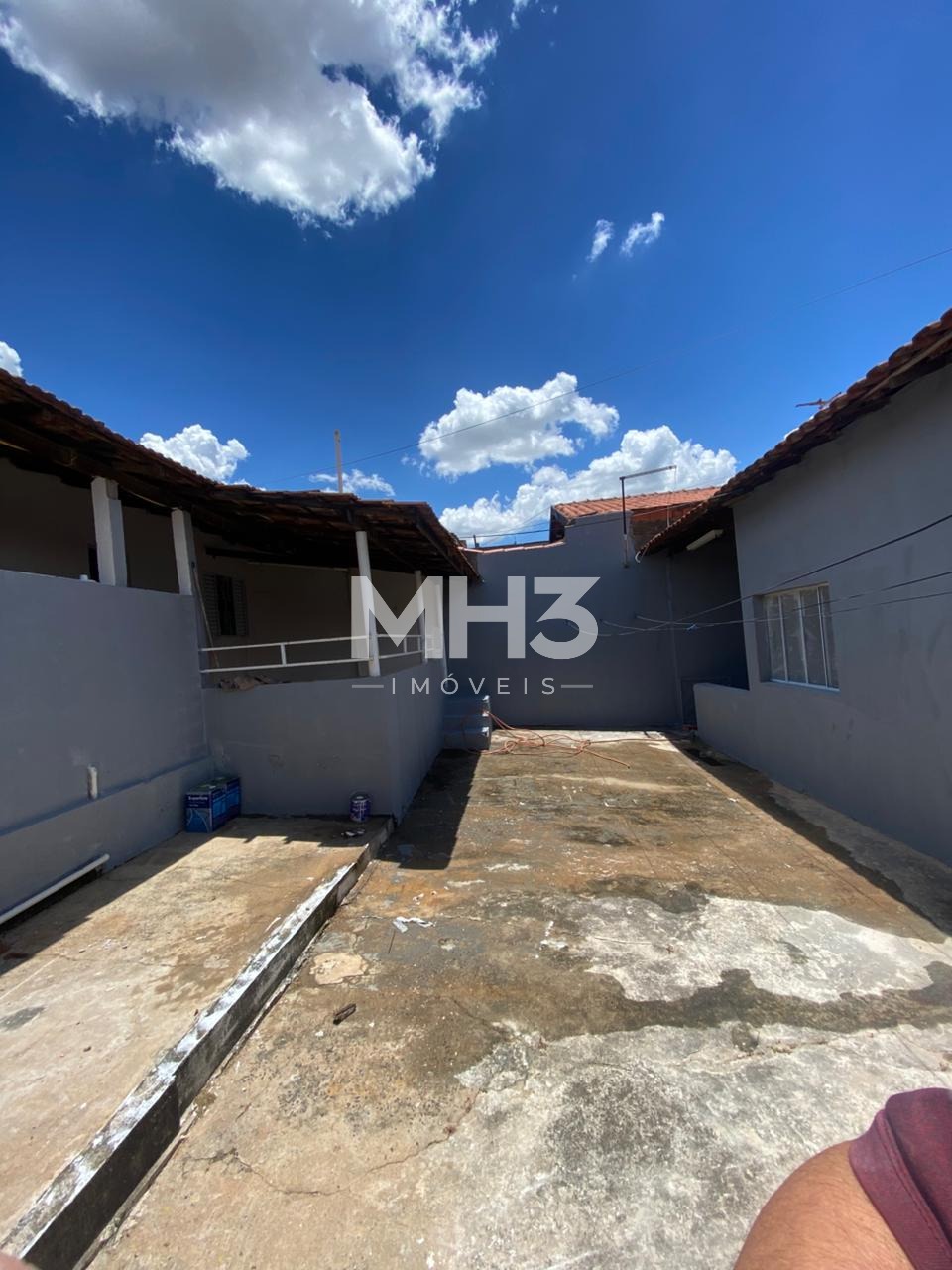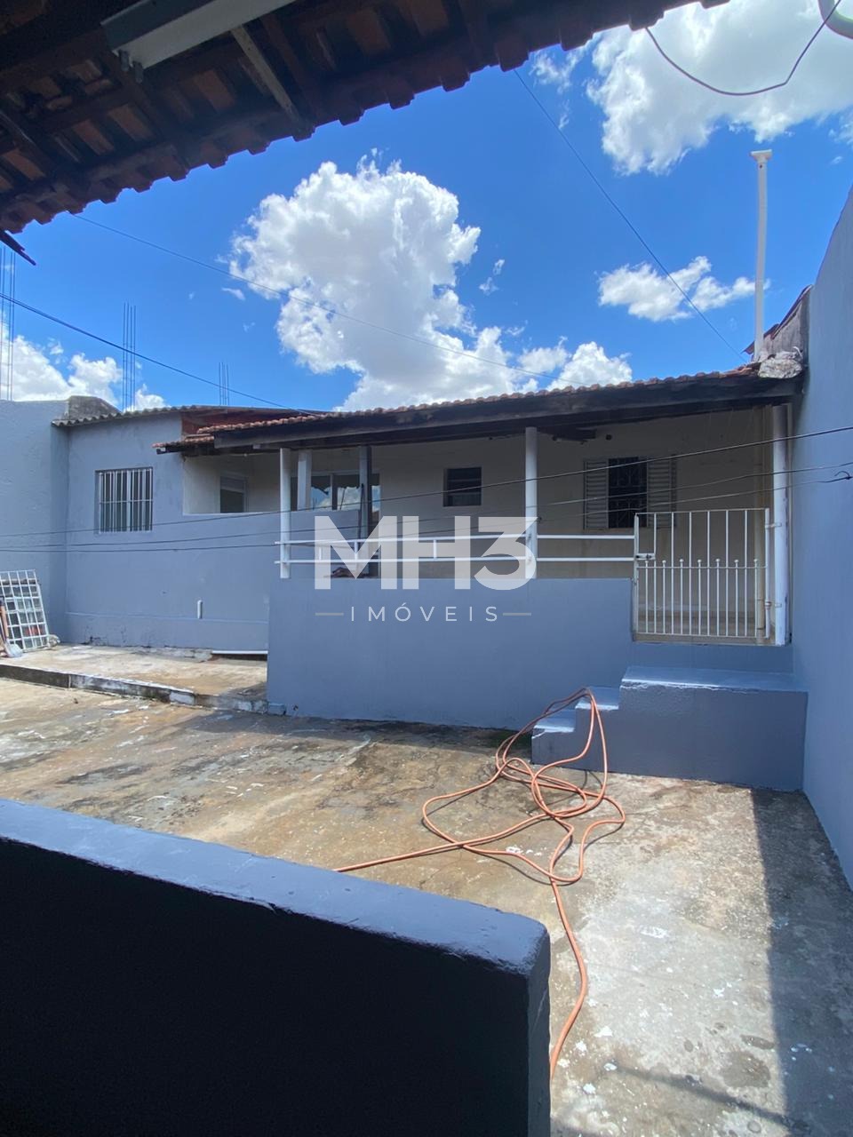 Casa da frente com sala, cozinha, banheiro, 3 dormitórios, área de serviço e quintal.