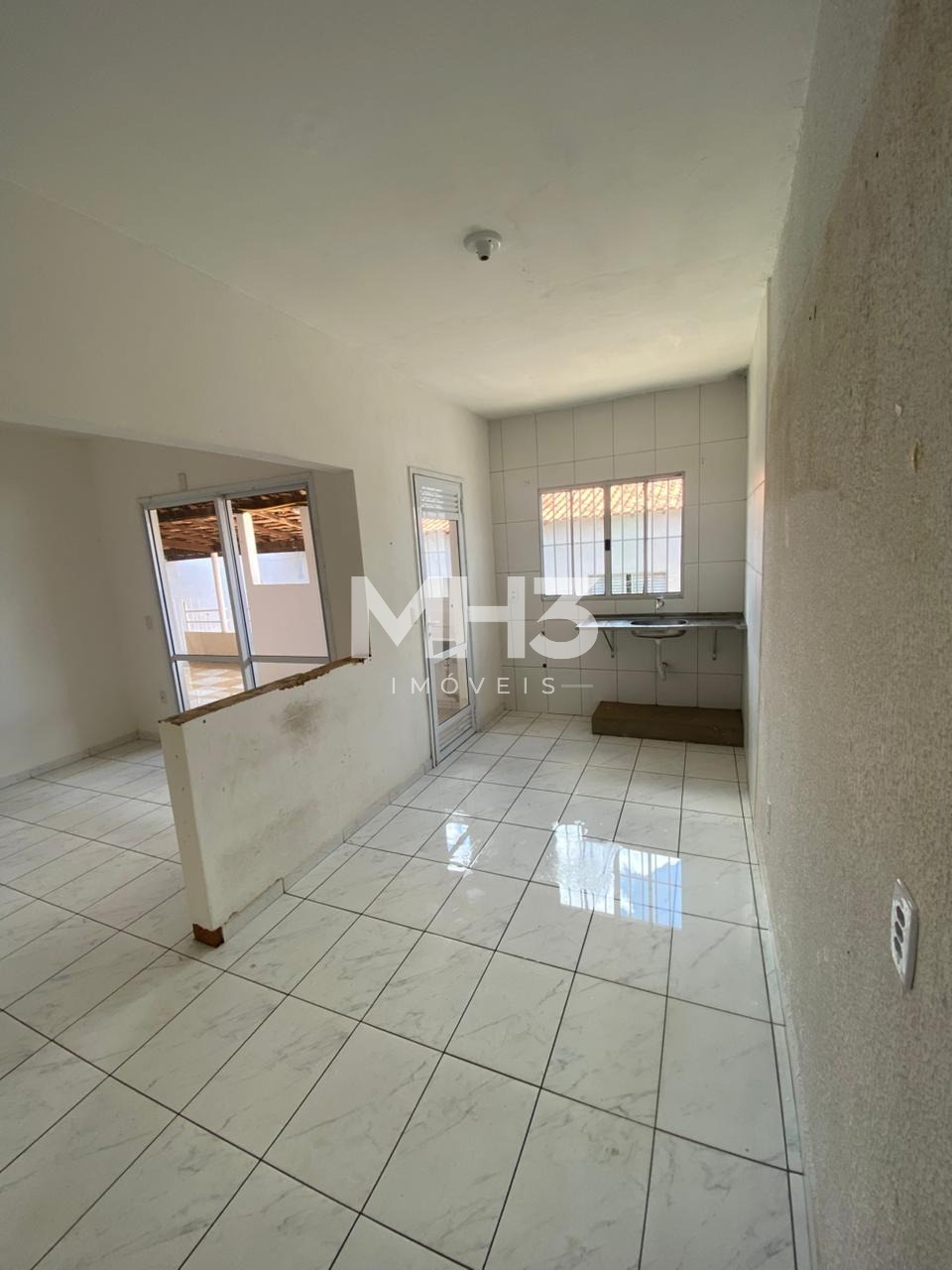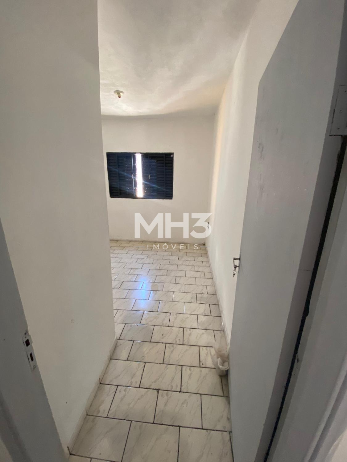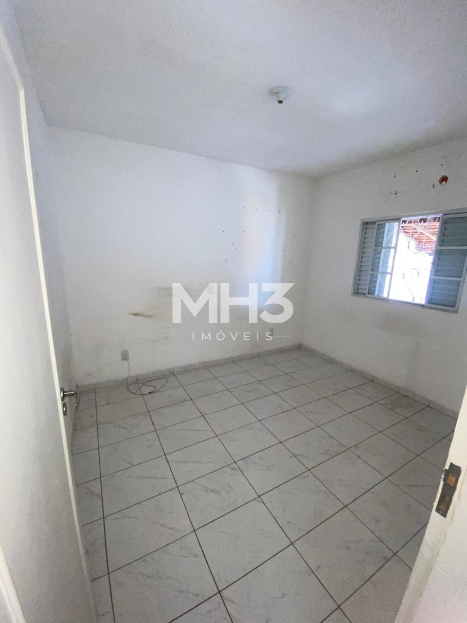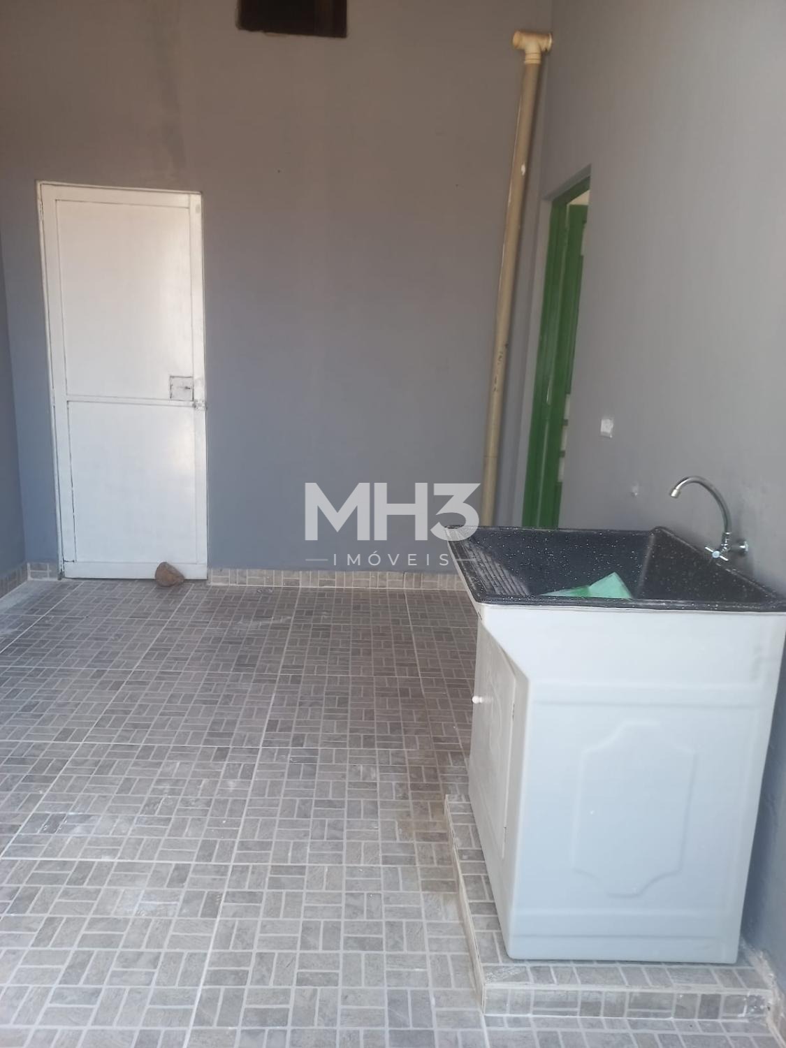 Casa da frente com sala, cozinha, banheiro, 3 dormitórios, área de serviço e quintal.