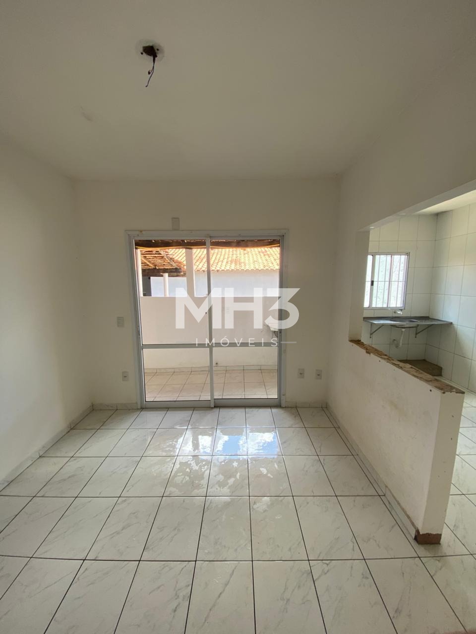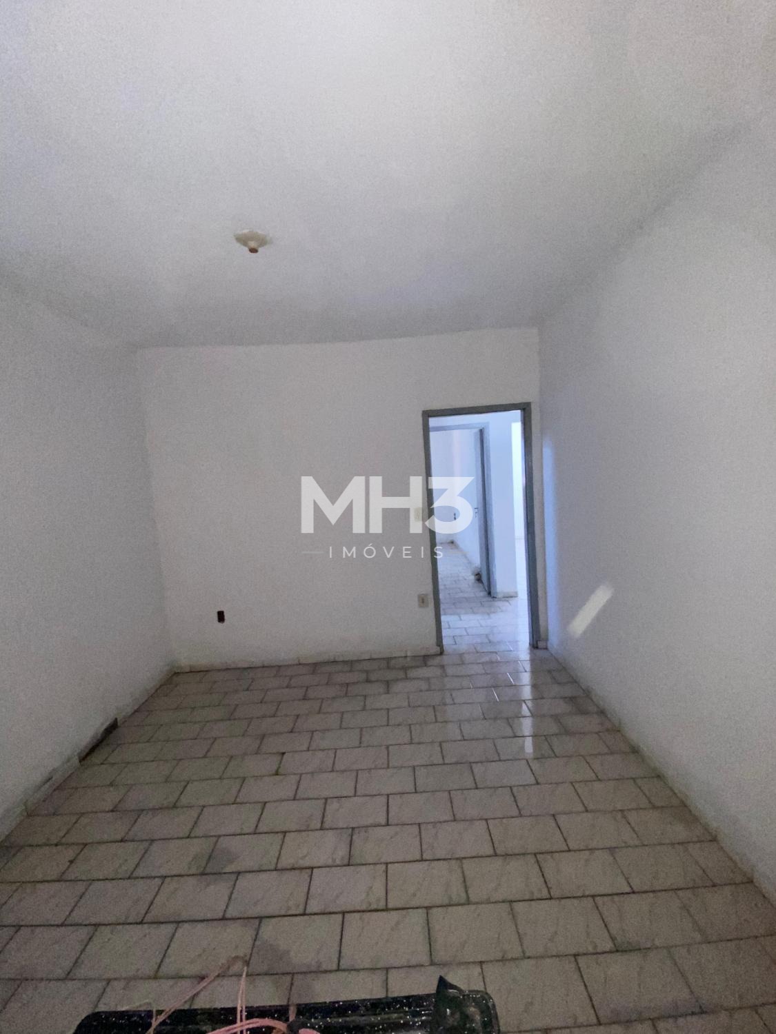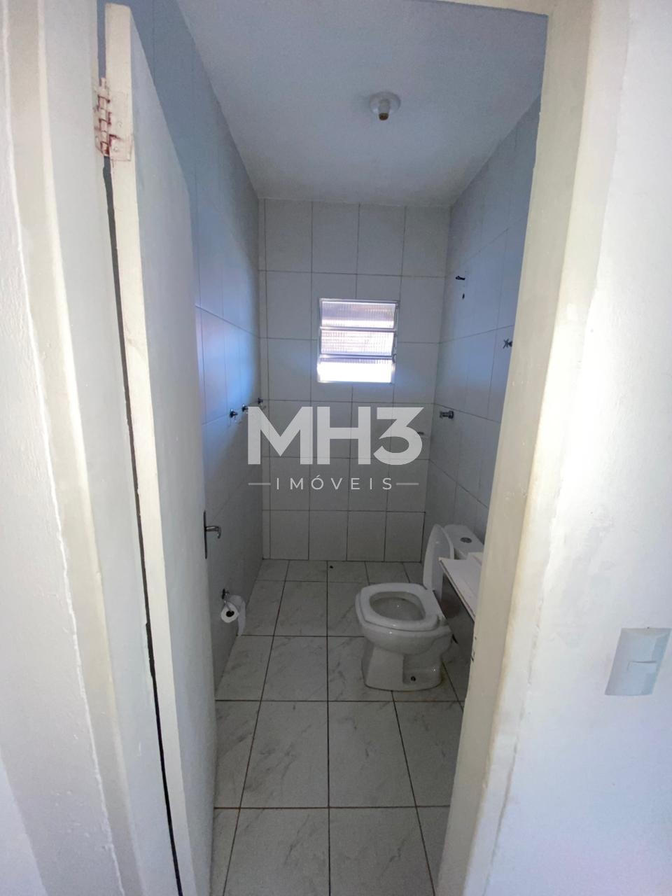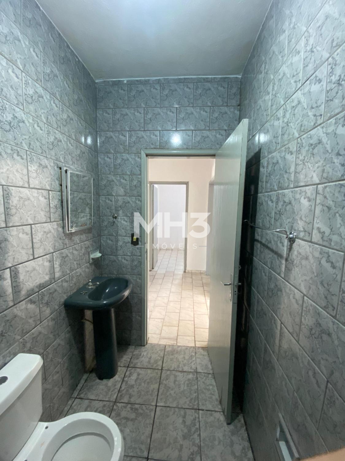 Casa da frente com sala, cozinha, banheiro, 3 dormitórios, área de serviço e quintal.