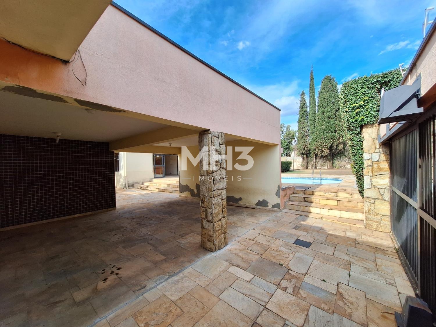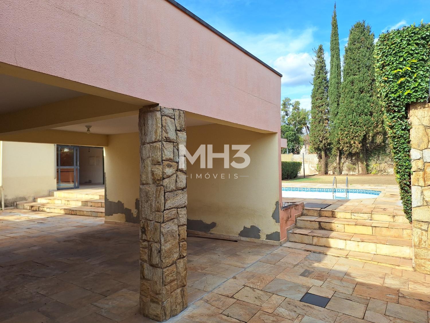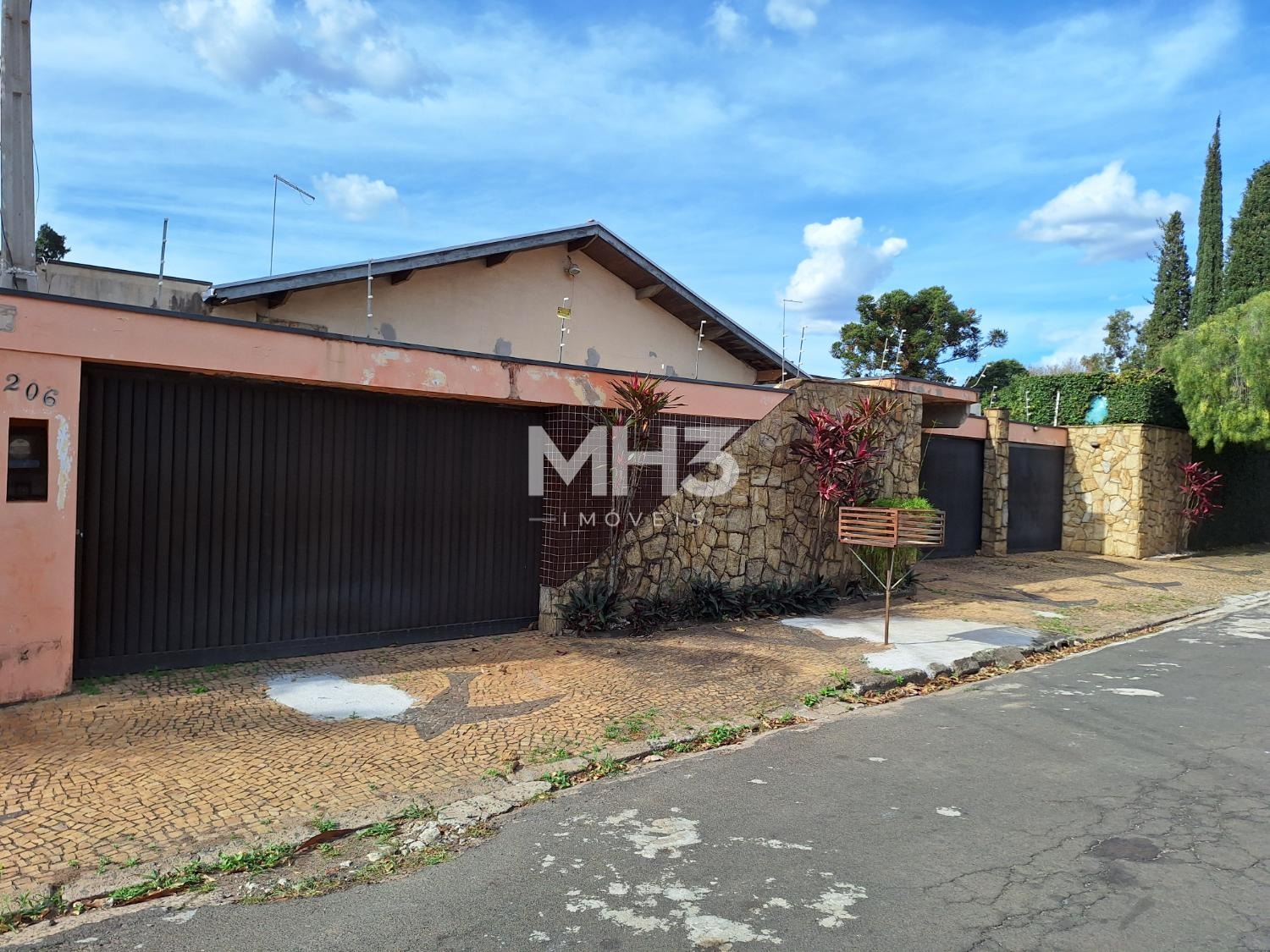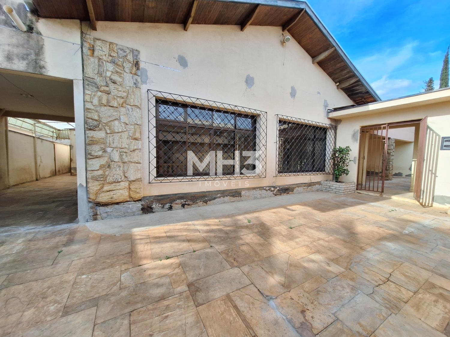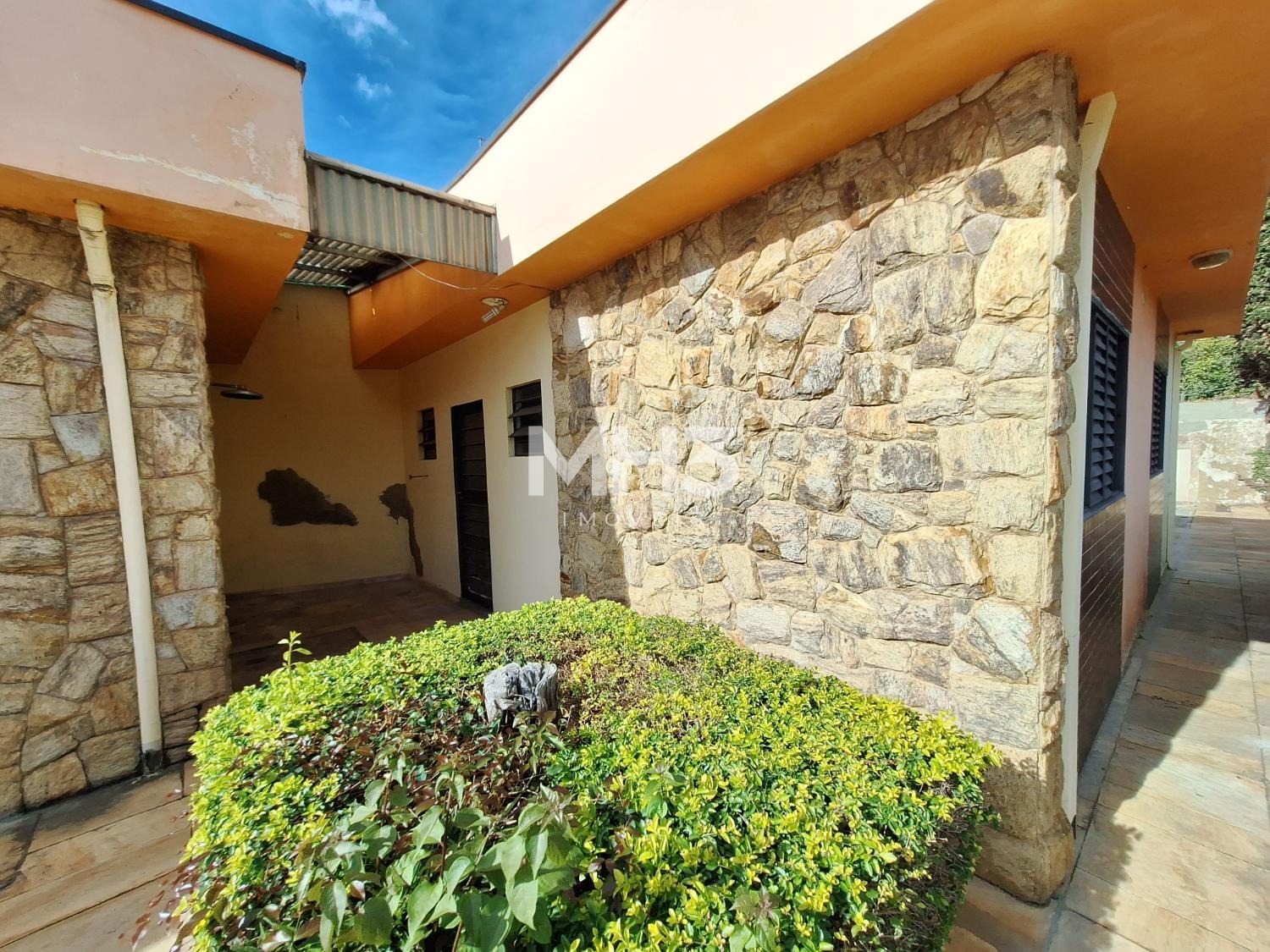 Muros alto com fachada em pedra na frente da casa e no quintal com vegetação, além de um portão de acesso independente.