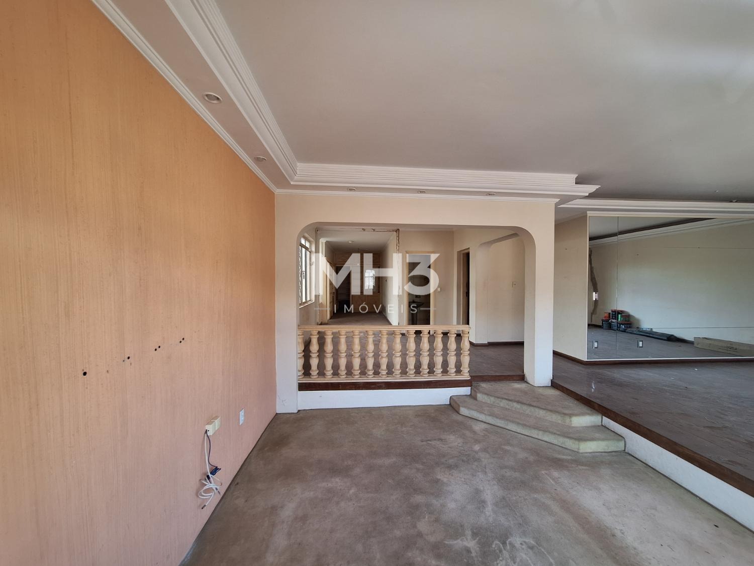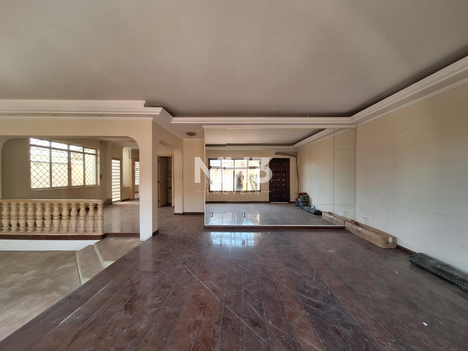 Salão amplo para 4 ambientes (hall de entrada, sala de tv, sala de estar, sala de jantar), lavabo, escritório, jardim de inverno com piso de madeira maciça.