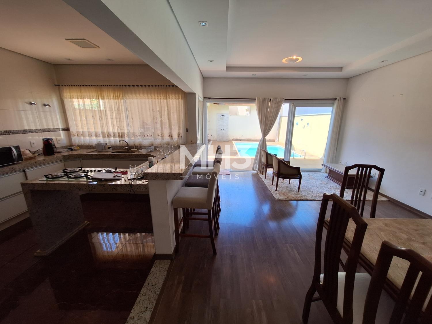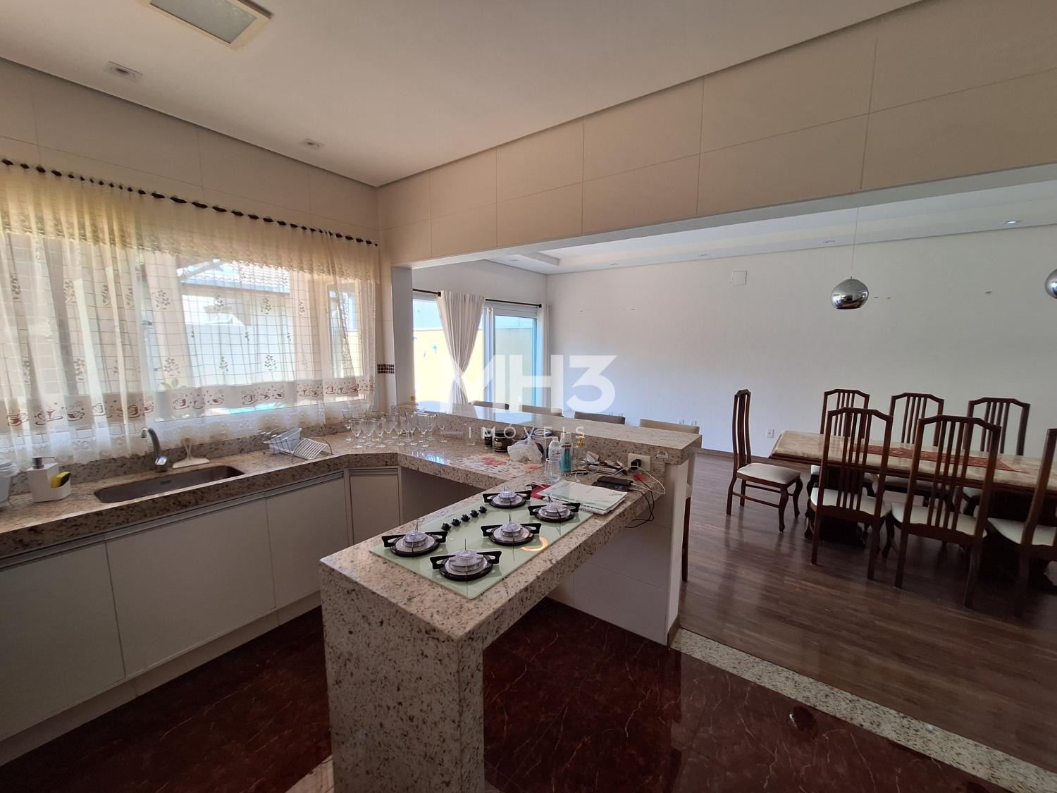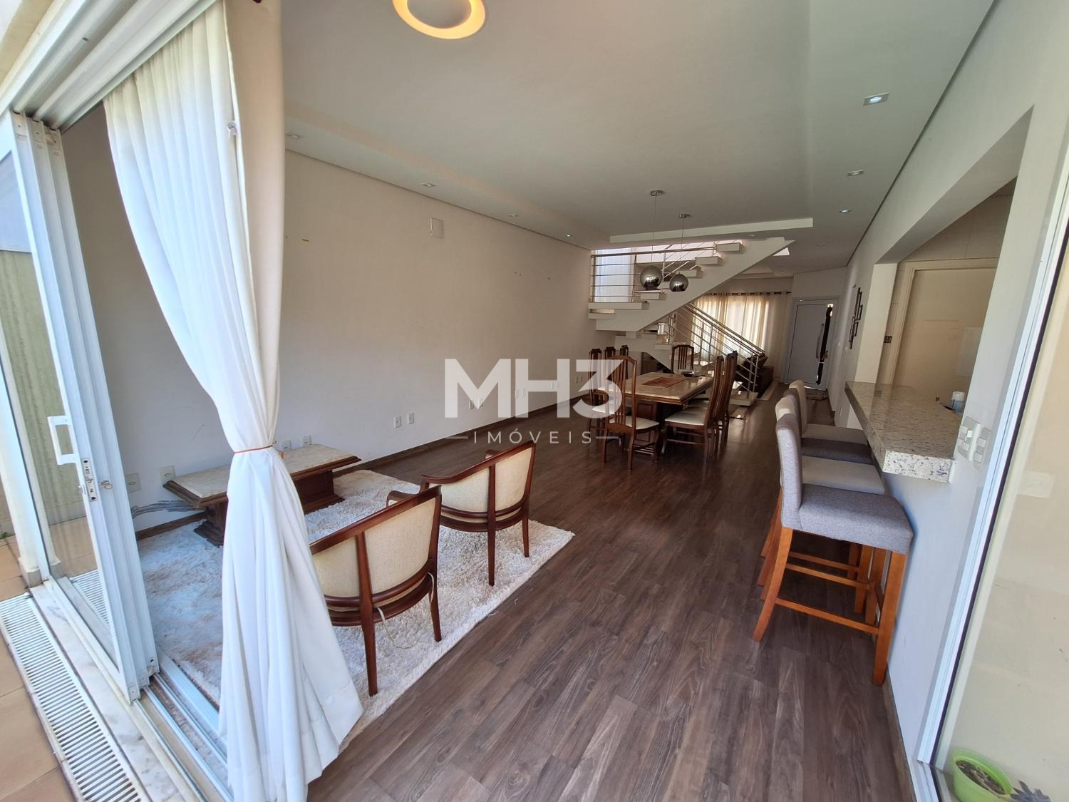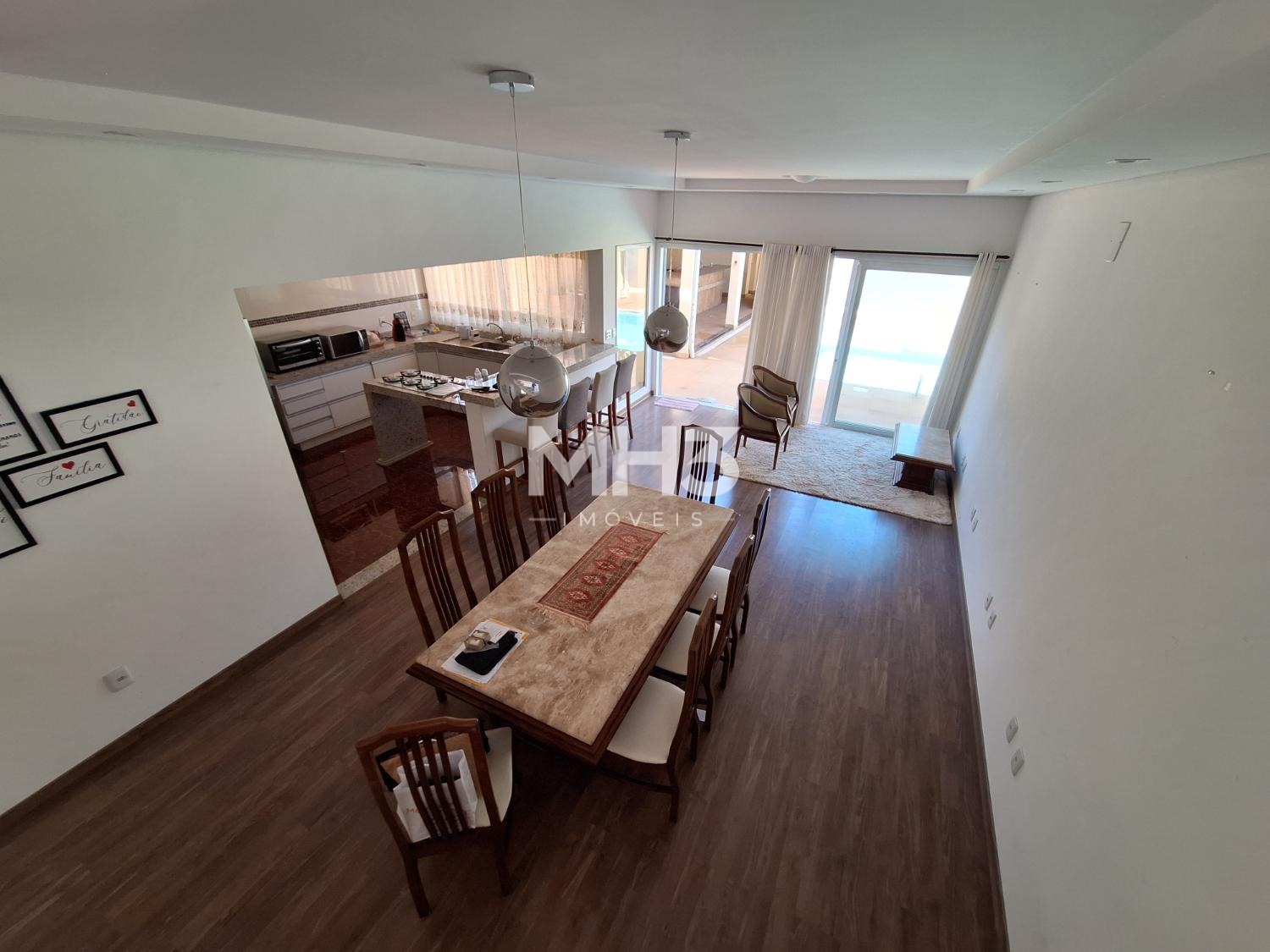 Piso térreo, hall de entrada com living amplo para 2 ambientes (sala tv e jantar), lavabo, cozinha gourmet anexa a área de serviço.