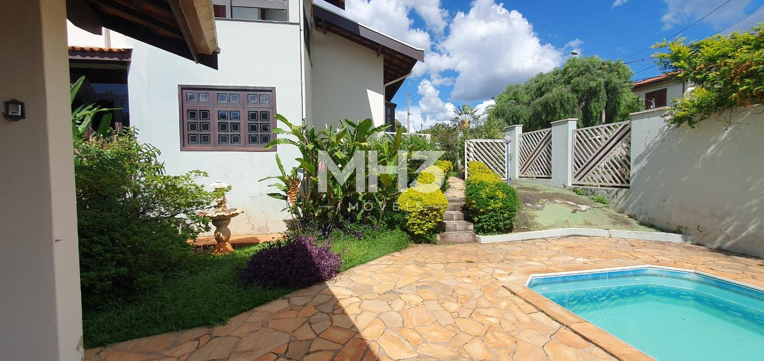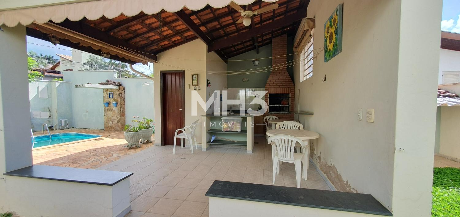 Parte social com jardim, área de churrasqueira, banheiro de apoio, canil e piscina com cascata e chuveirão.