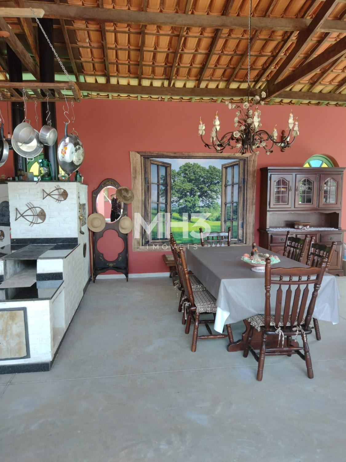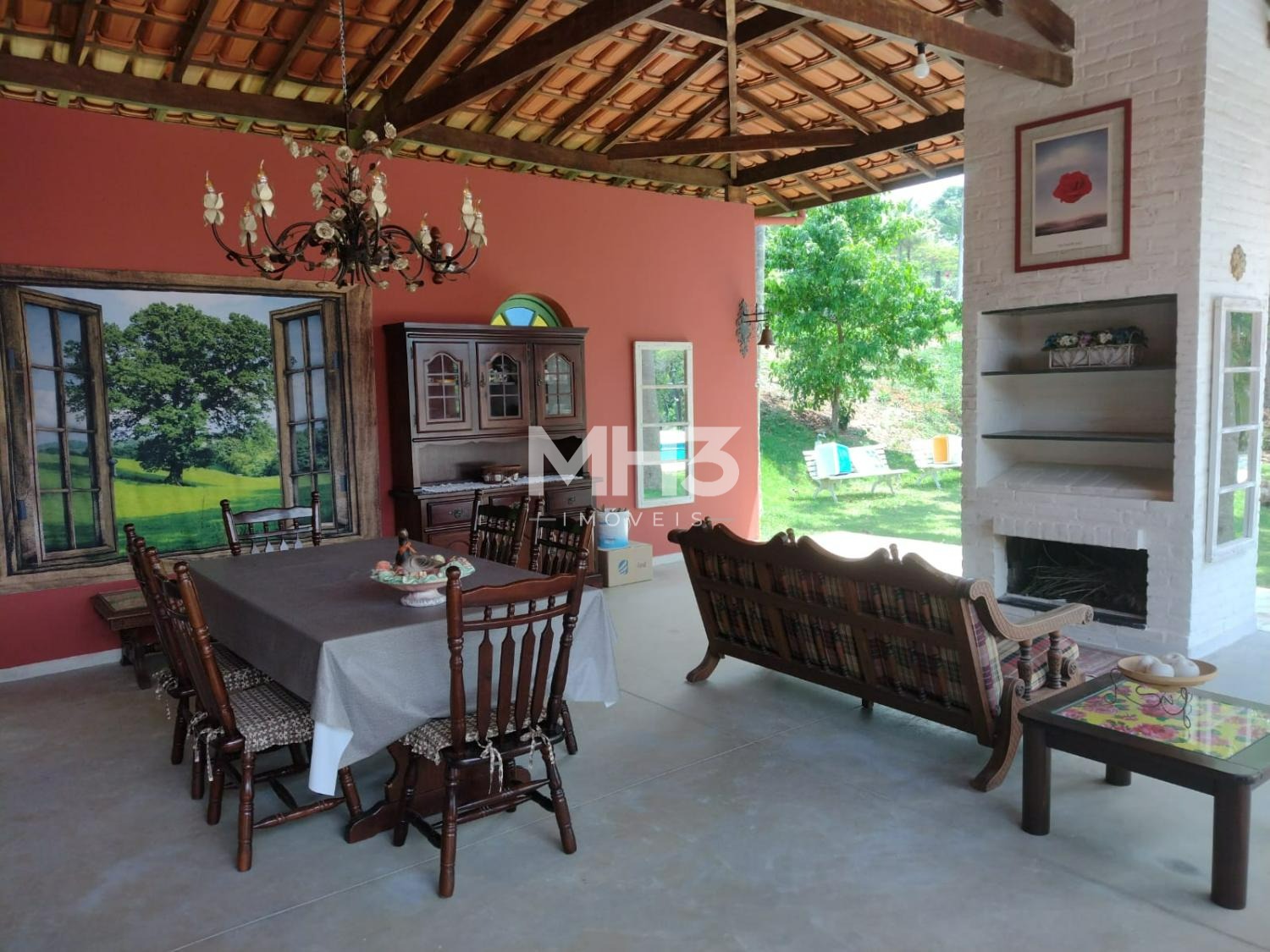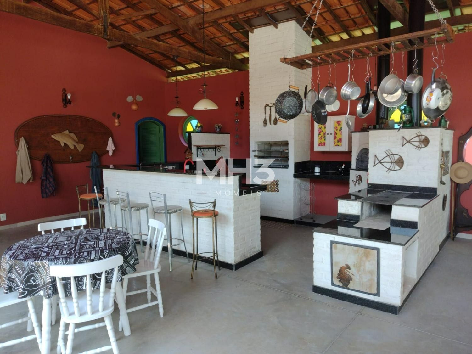 Área social com espaço Gourmet, varanda toda integrada a casa, lareira, fogão à lenha, acabamento rústico.