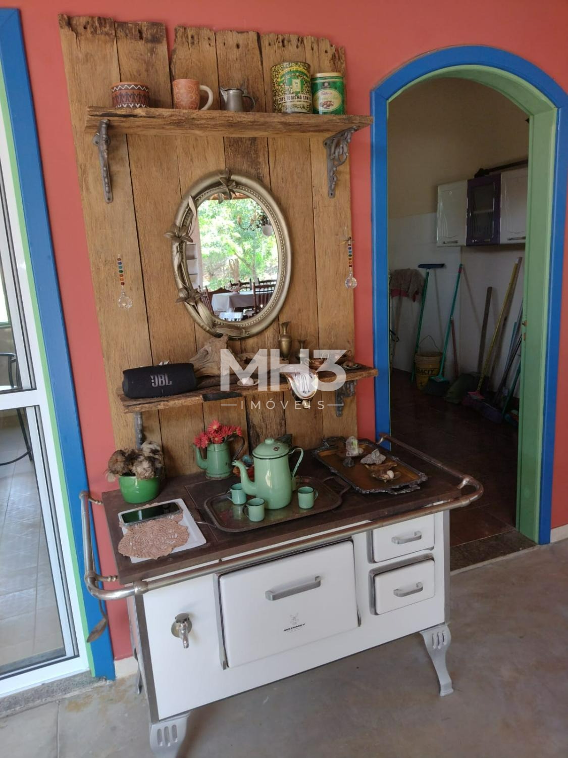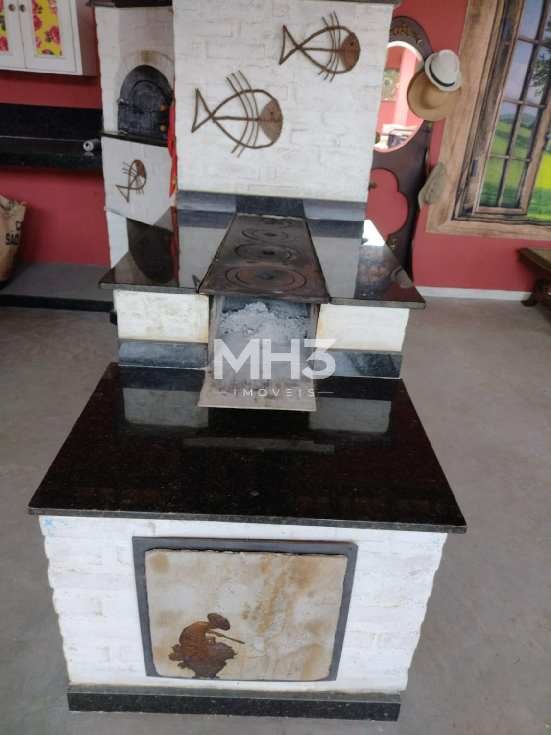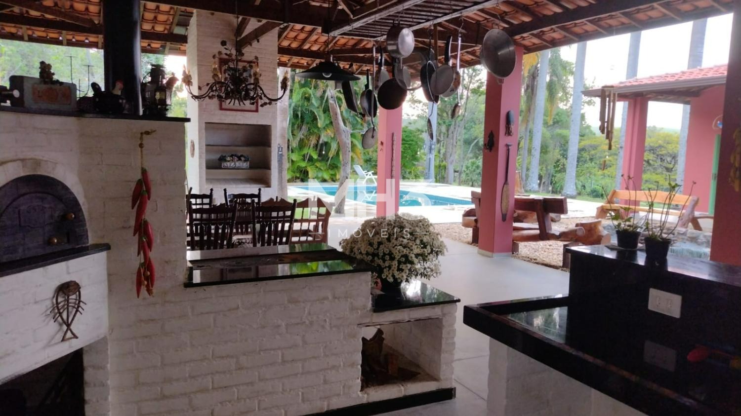 Área social com espaço Gourmet, varanda toda integrada a casa, lareira, fogão à lenha, acabamento rústico.