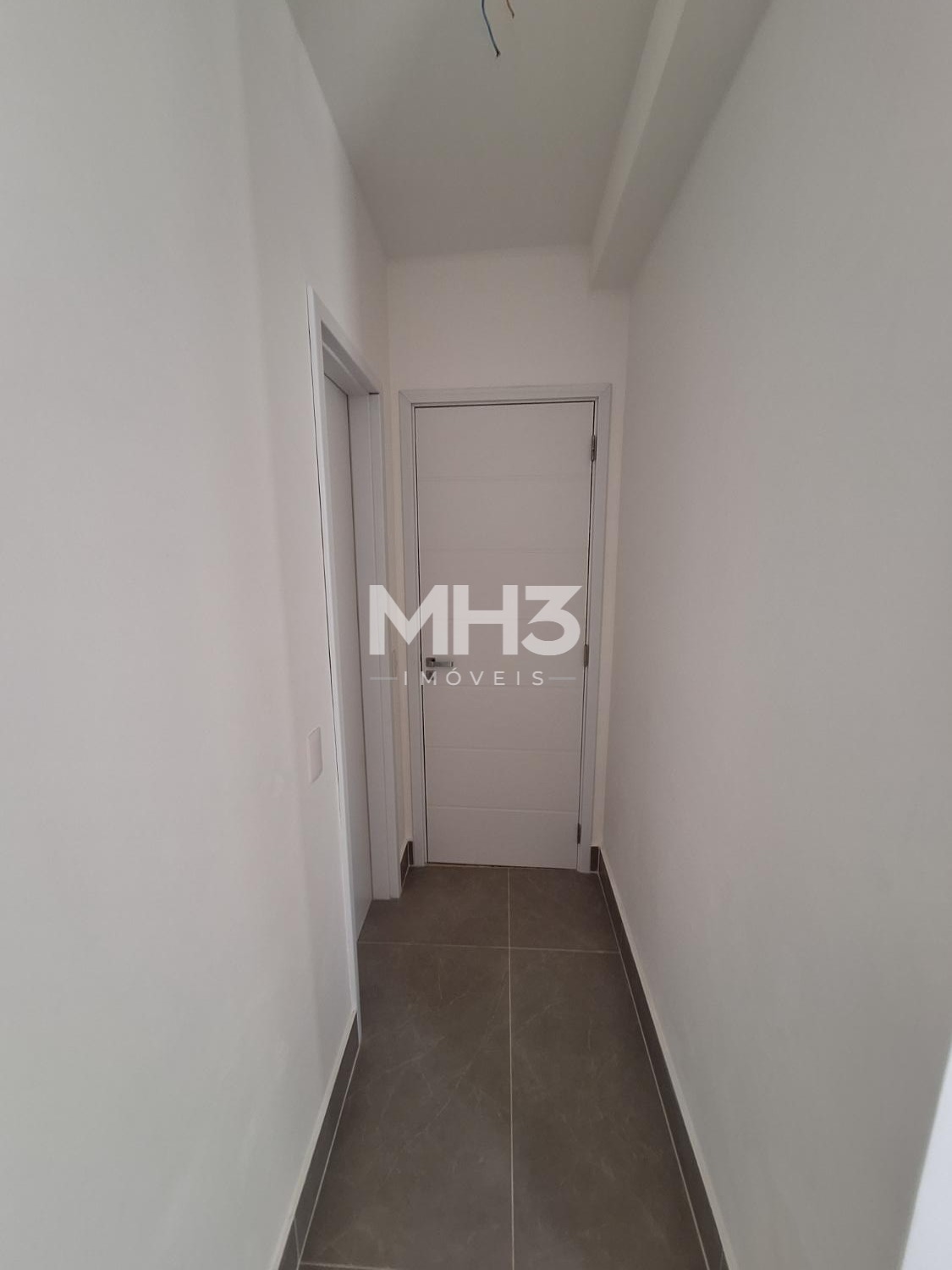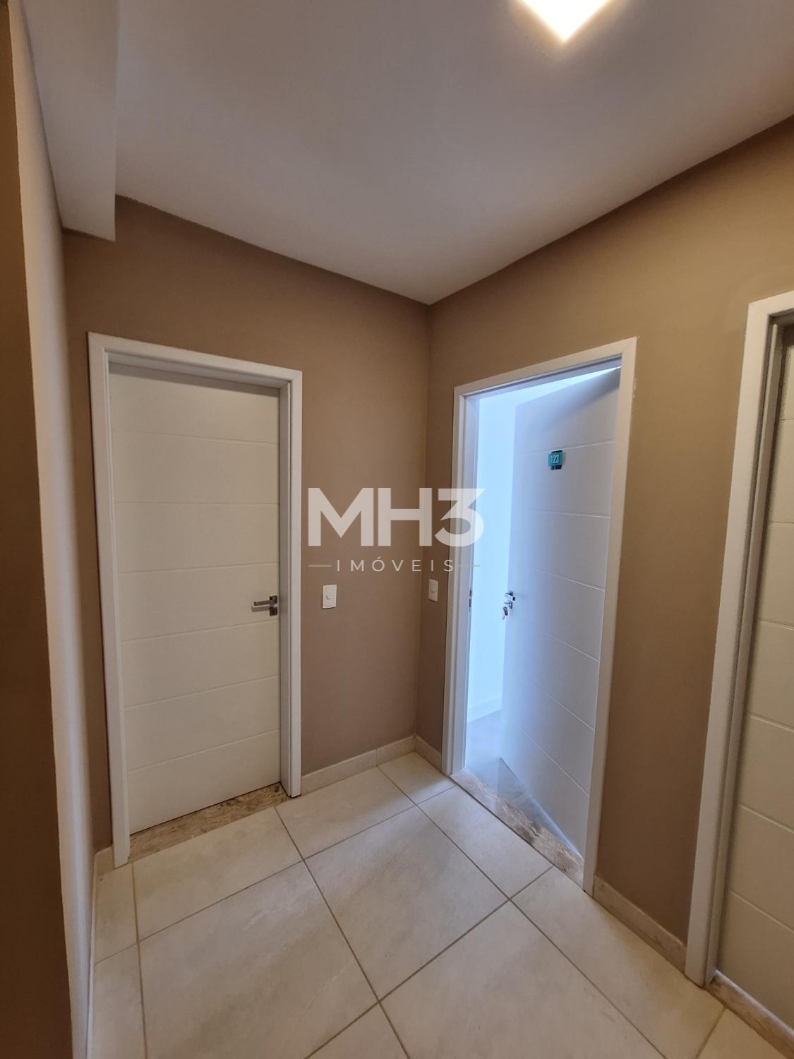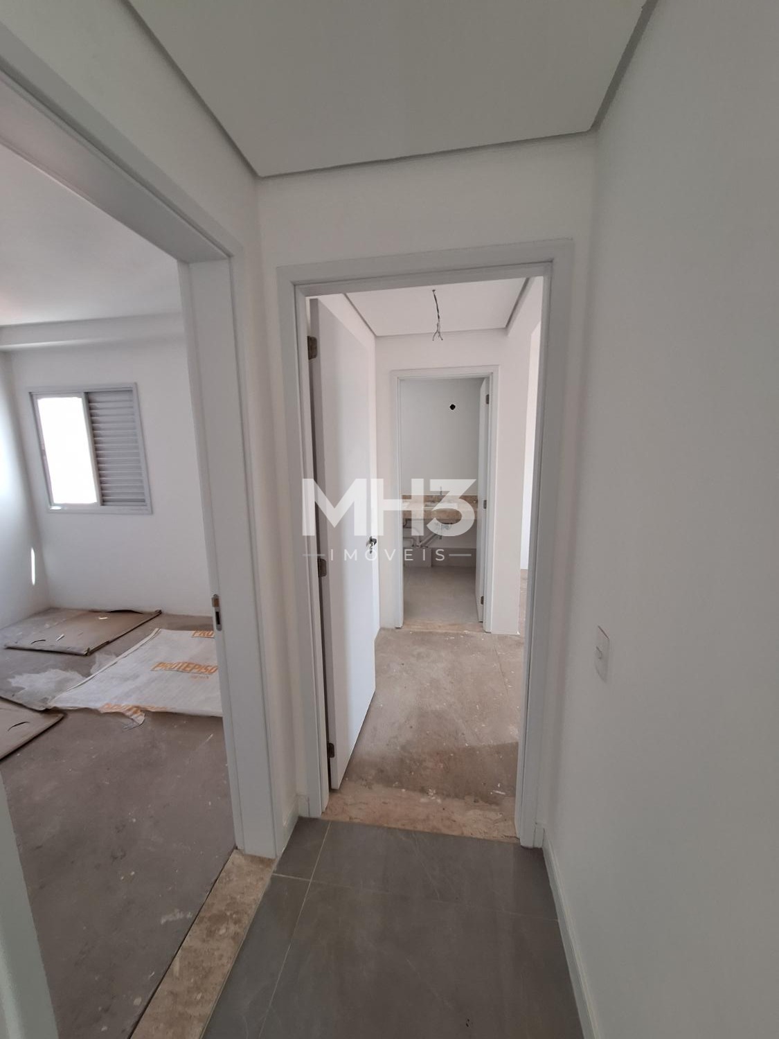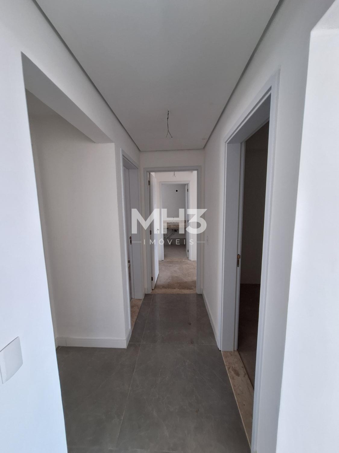 Corredor íntimo, banheiro social e três quartos sendo uma suíte ampla com closet.