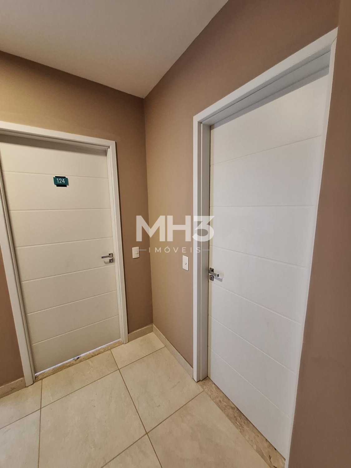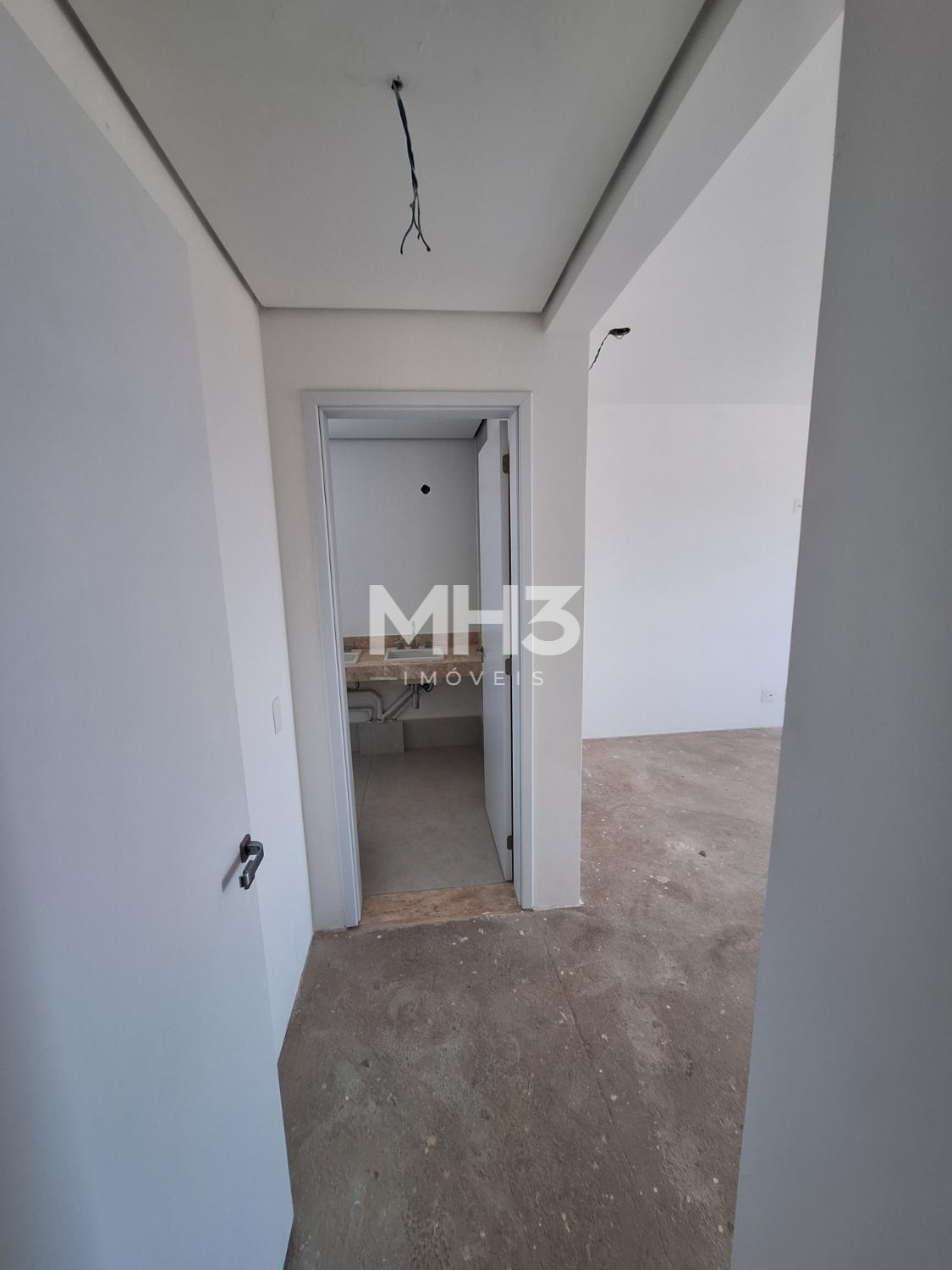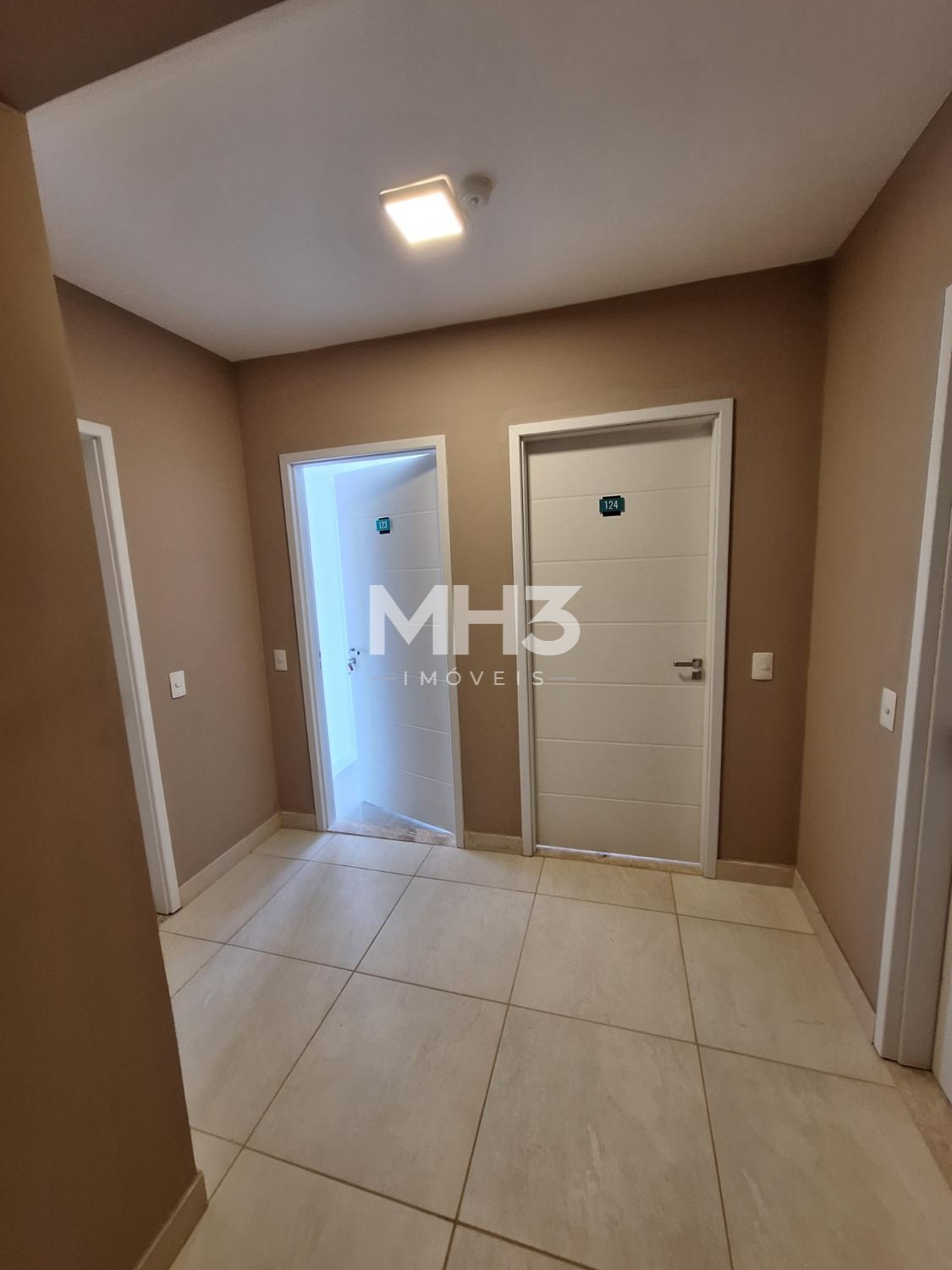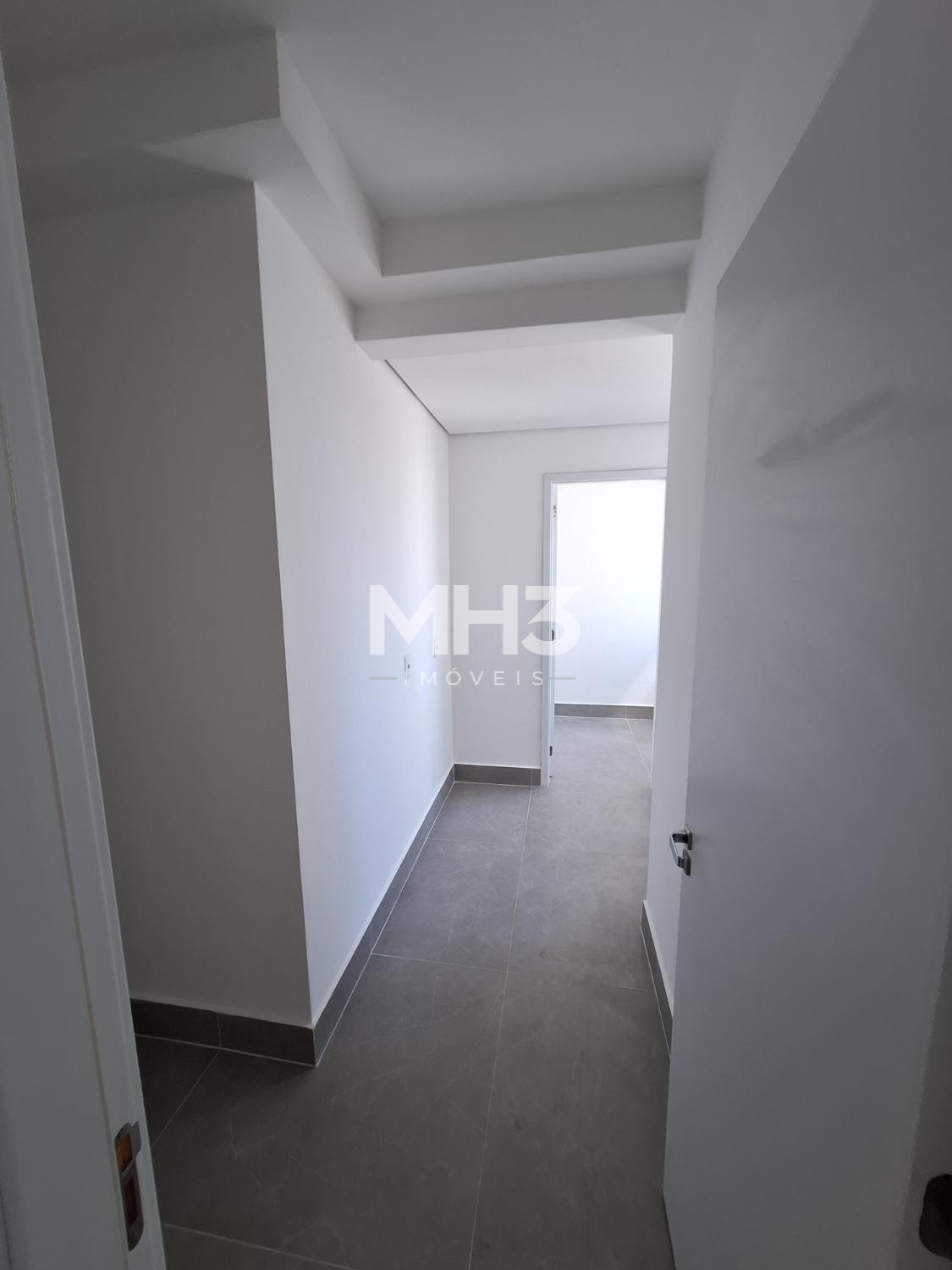 Corredor íntimo, banheiro social e três quartos sendo uma suíte ampla com closet.