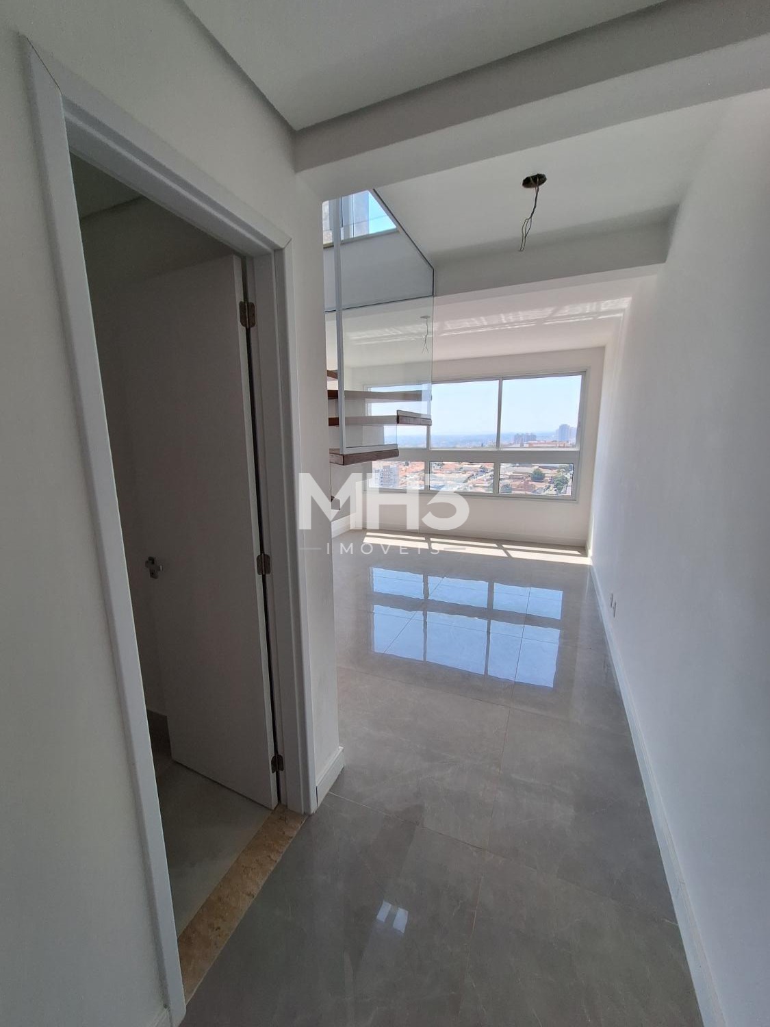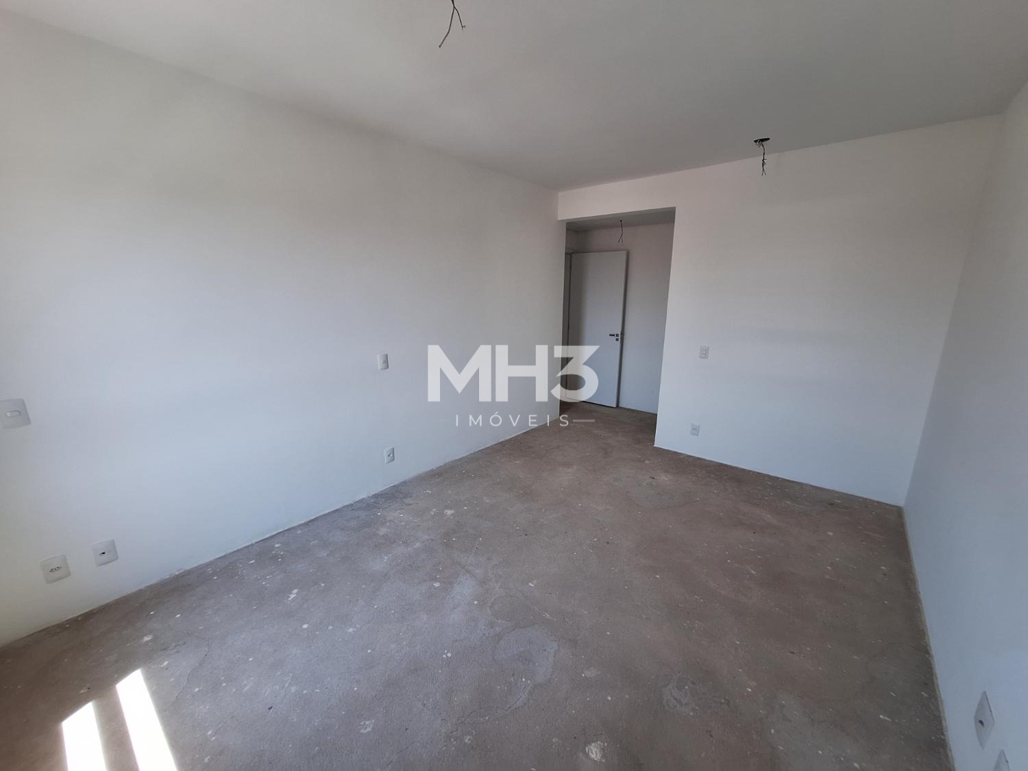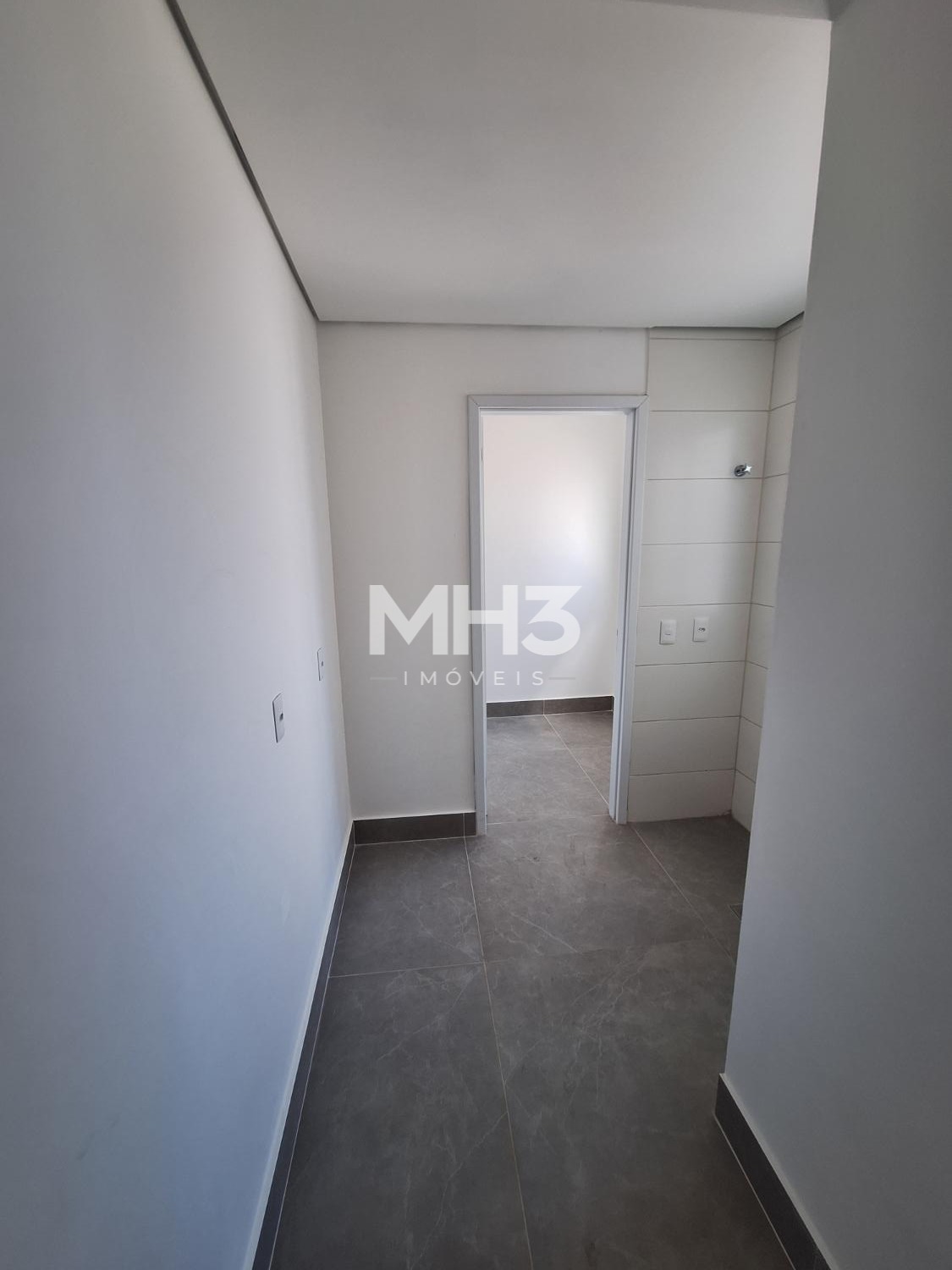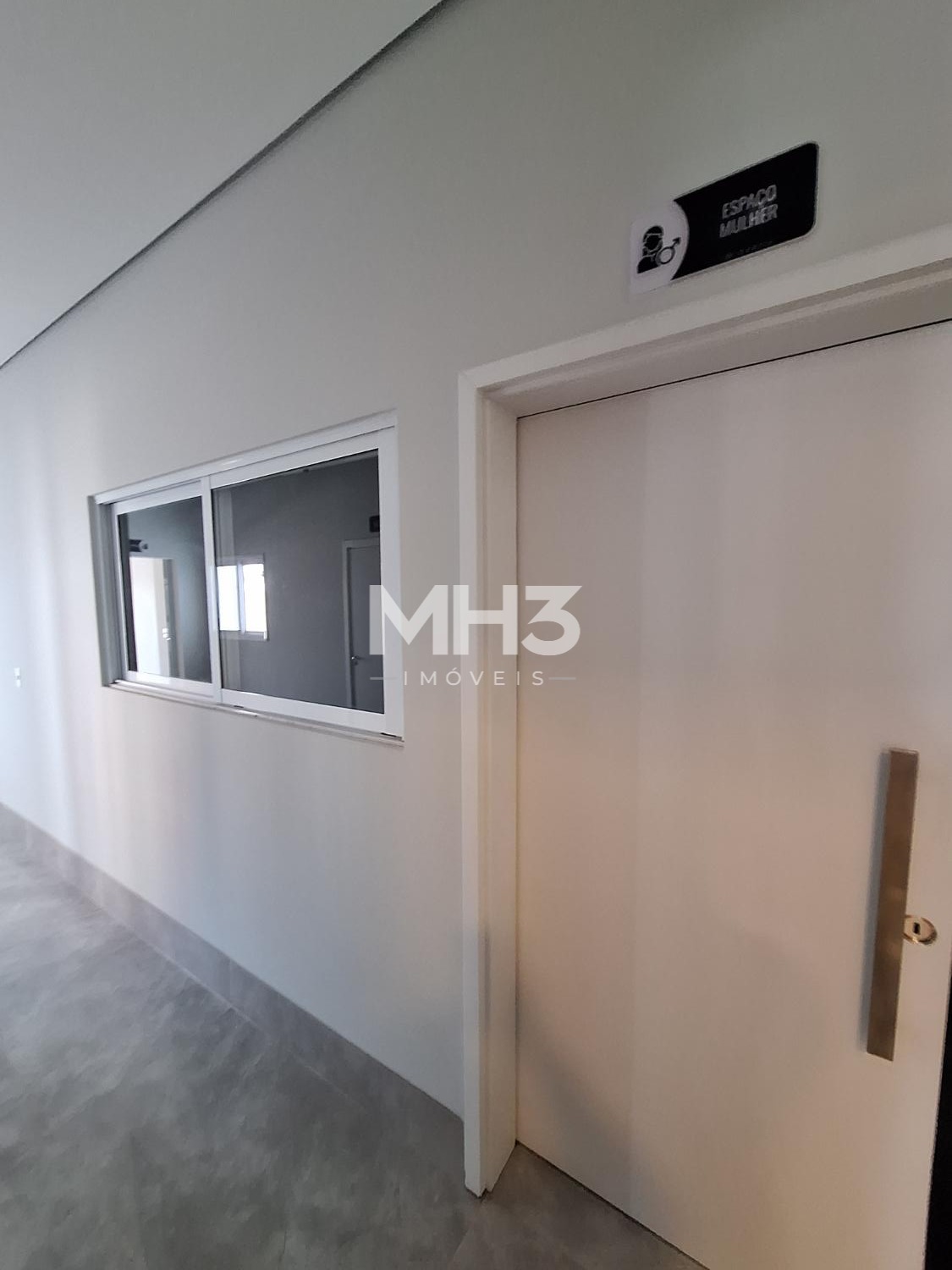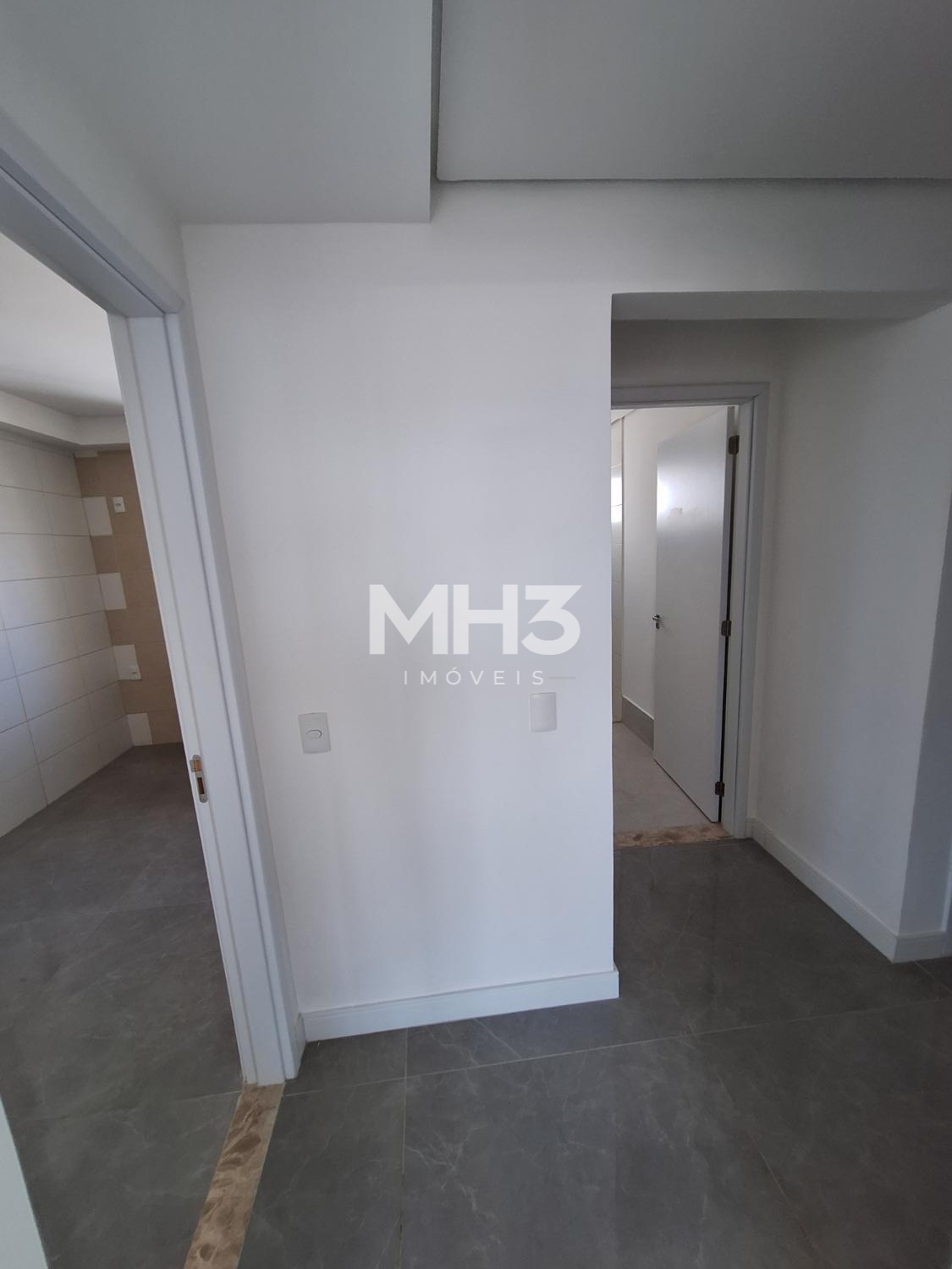 Corredor íntimo, banheiro social e três quartos sendo uma suíte ampla com closet.