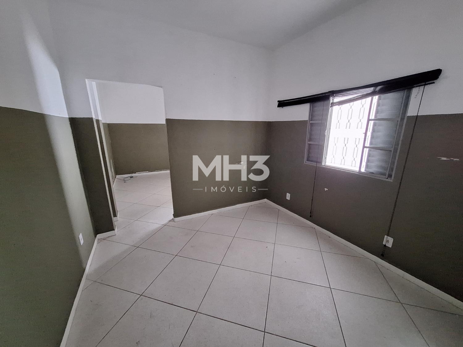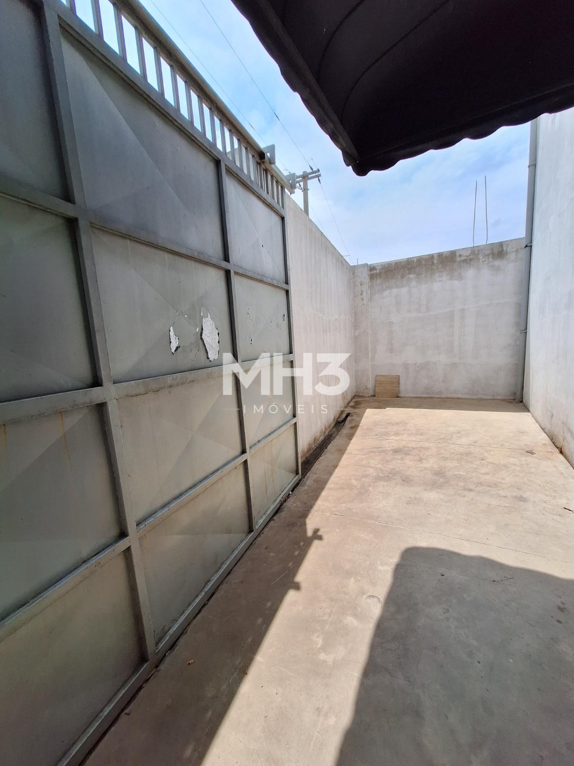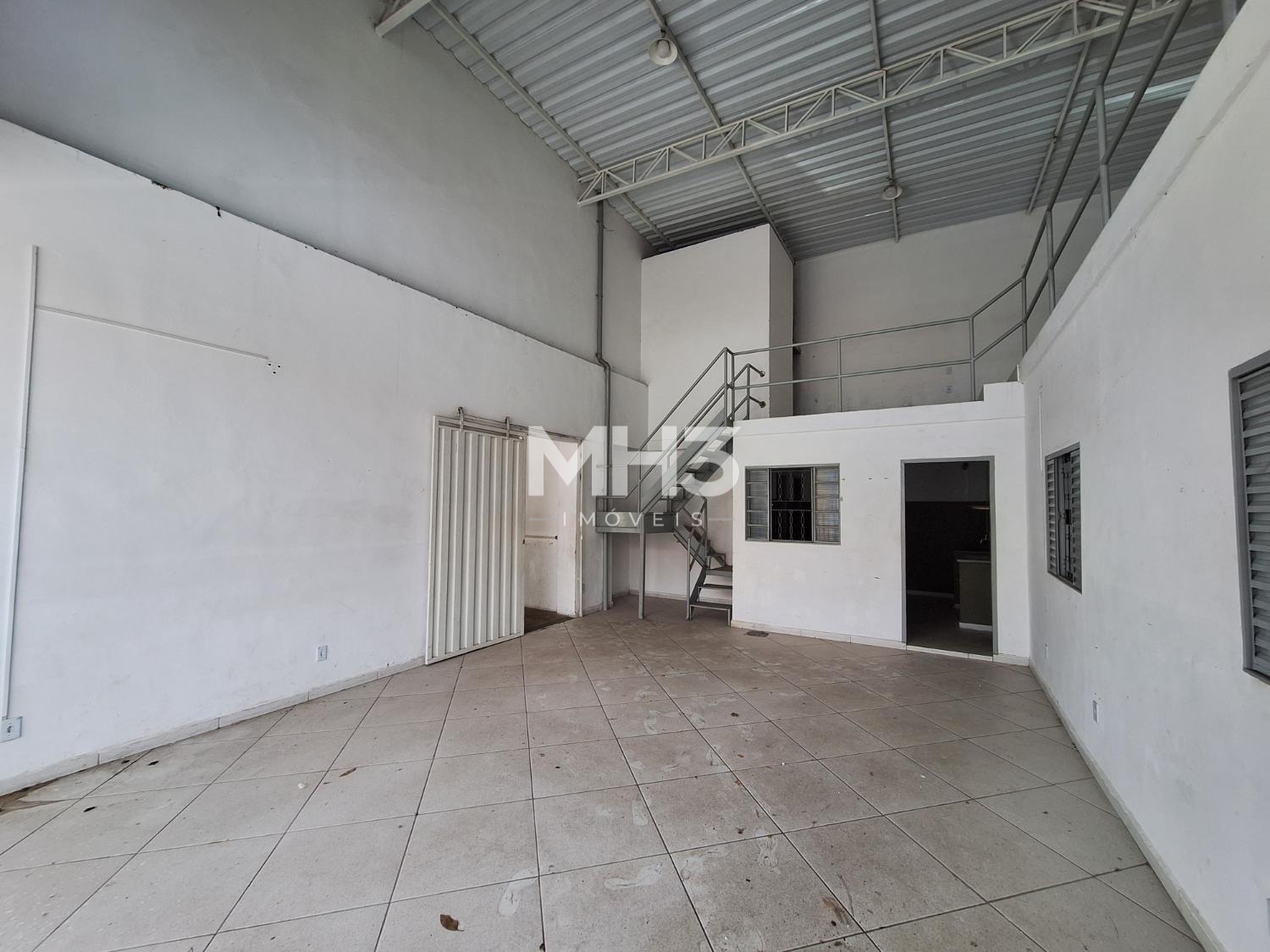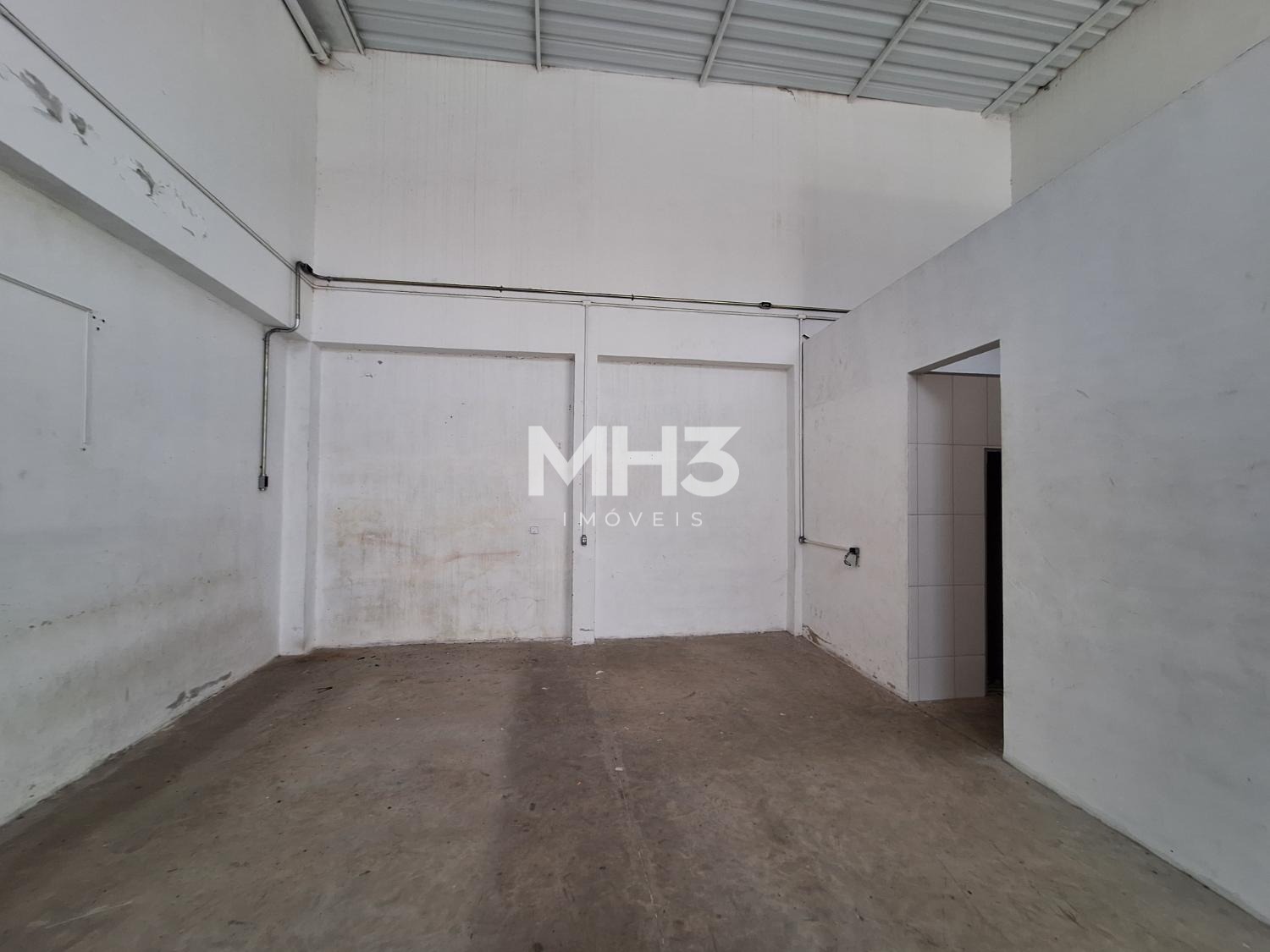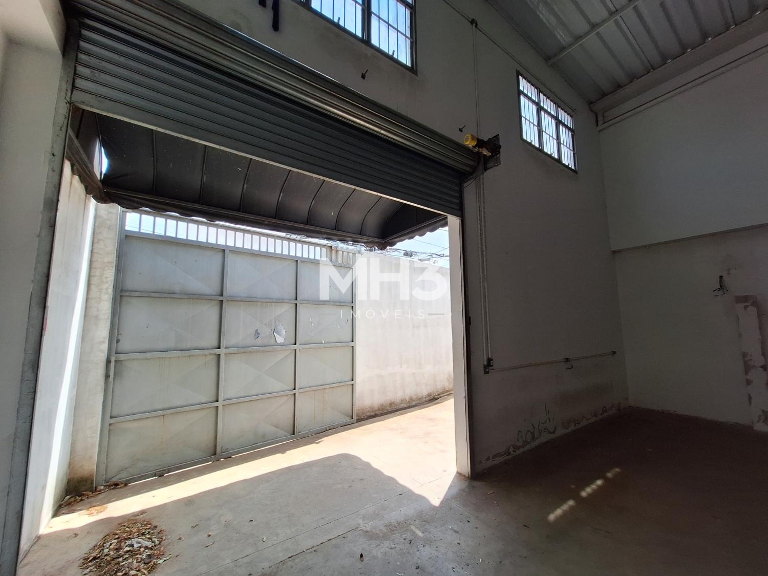 Galpão fracionado em dois ambientes, sendo o primeiro com acesso por porta de pedestre e portão eletrônico para acesso de VUC.