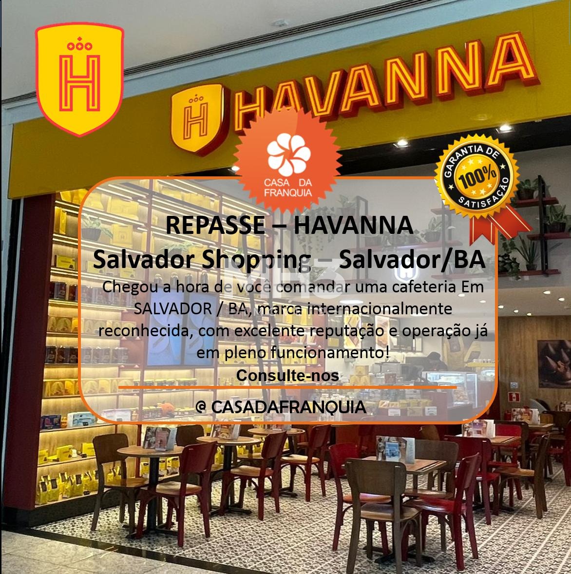 • Está disponível para repasse uma franquia Havanna, clássica e tradicional marca argentina reconhecida pela qualidade de seus cafés, alfajores e produtos exclusivos. A unidade está em pleno funcionamento no Salvador Shopping, um dos centros comerciais mais movimentados e valorizados da Bahia.